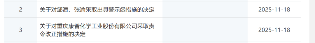 11月18日,重庆证监局网站发布《关于对重庆康普化学工业股份有限公司采取责令改正措施的决定》《关于对邹潜、张渝采取出具警示函措施的决定》。